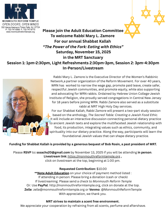 MRT’s Adult Education Committee in conjunction with our Director of Education plans and presents programs and events that enrich our understanding of Jewish life in the 21st century, that inspire our desire to learn more about Jewish history through past and current writings and that encourage us to gain new insights as we delve more deeply into Torah . These goals are accomplished throughout the year with special programs. View the upcoming plans for these programs as well as information about our Library and, of course(!), our beautiful Holiday Handbook!